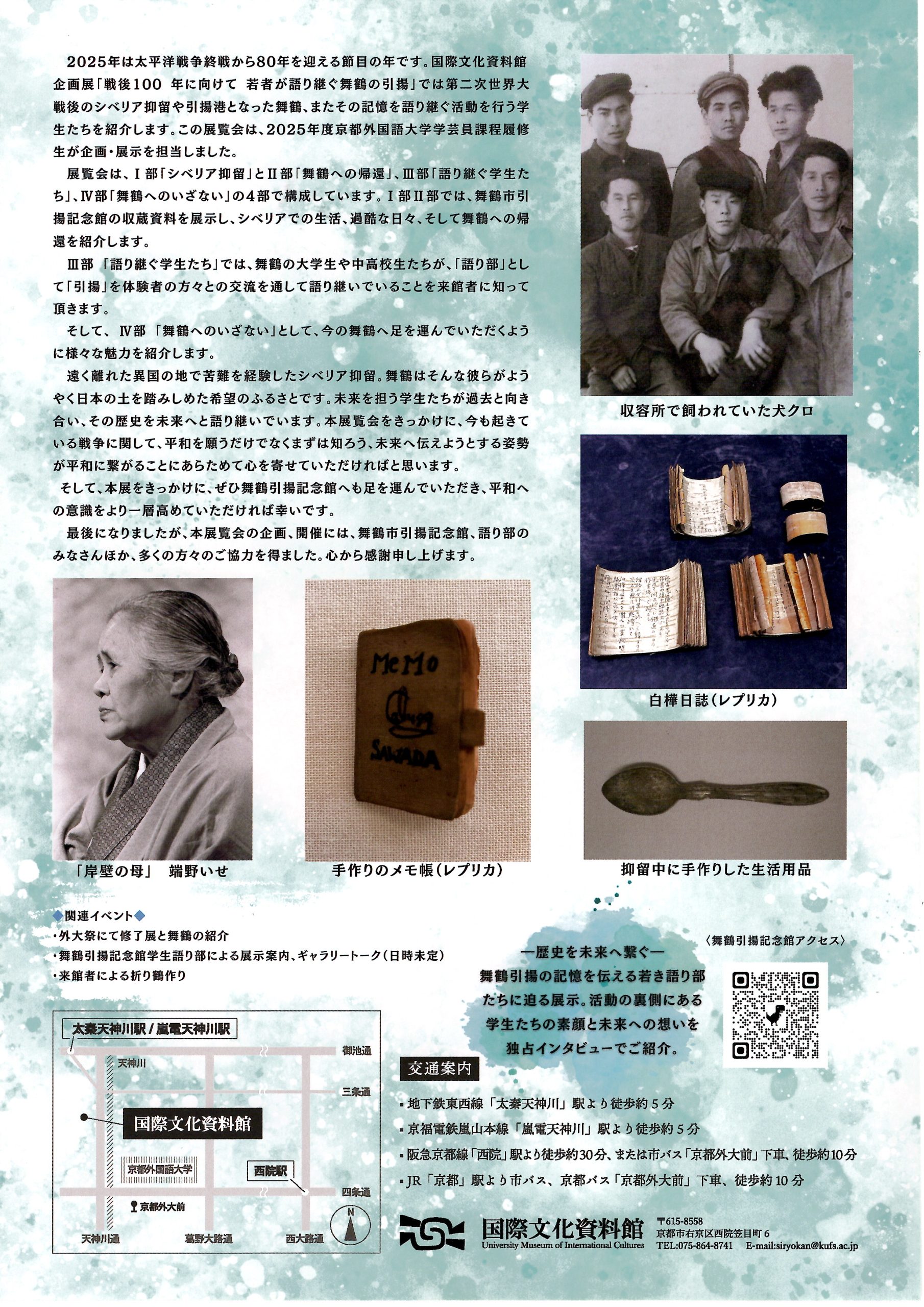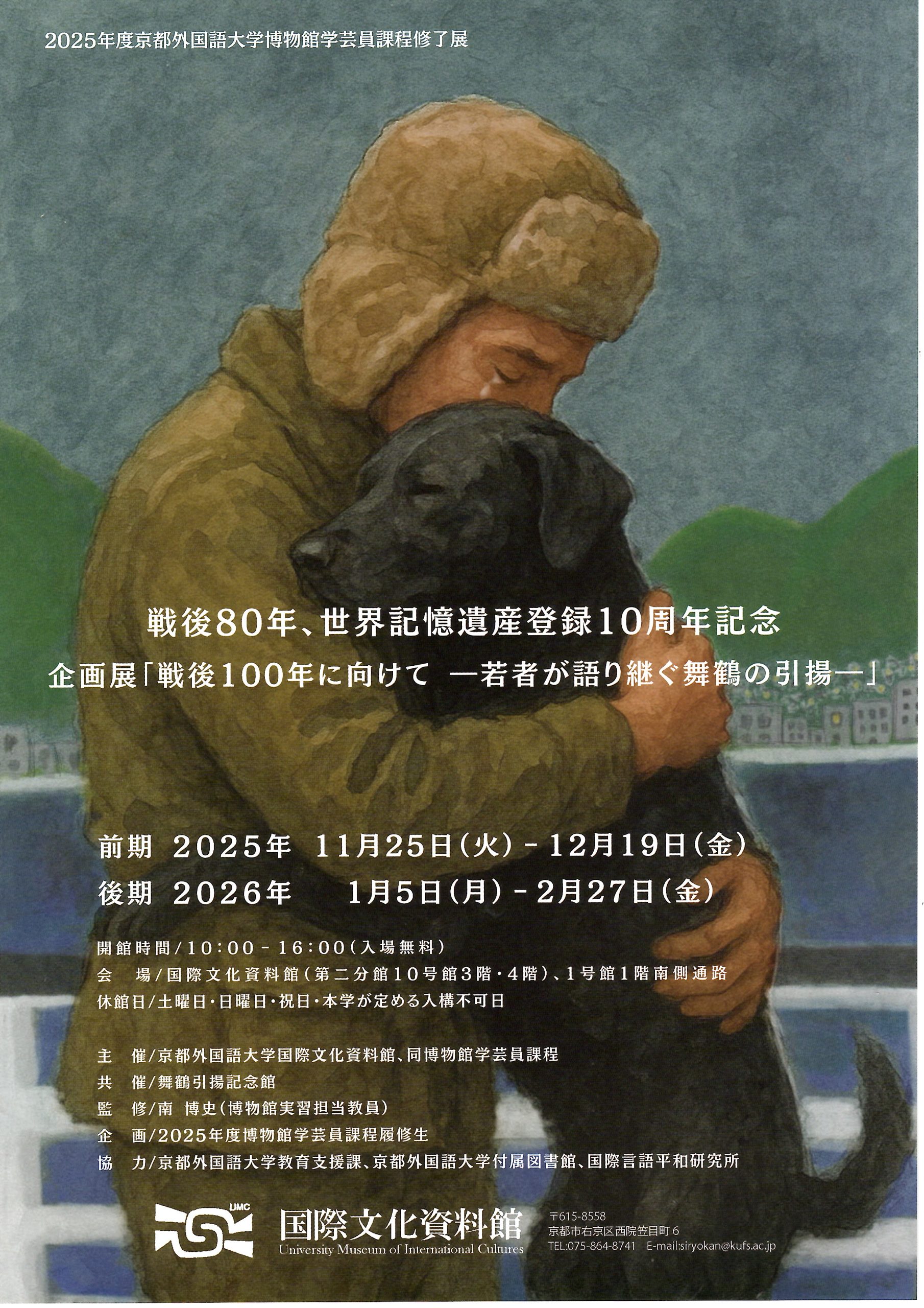 舞鶴市がユネスコ世界記憶遺産登録に向けて設置した「舞鶴市世界記憶遺産有識者会議」の委員をされていたクレイグ・スミス教授(故人)が所属されるなど、縁のある京都外国語大学と連携し、戦後80年ユネスコ世界記憶遺産登録10周年を記念した展覧会「戦後100年に向けてー若者が語り継ぐ舞鶴の引揚ー」を同大学の資料館や構内で開催します。